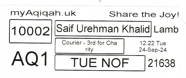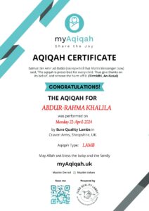 - For full transparency we send you the Aqiqah carcass label showing date, time and your baby’s name